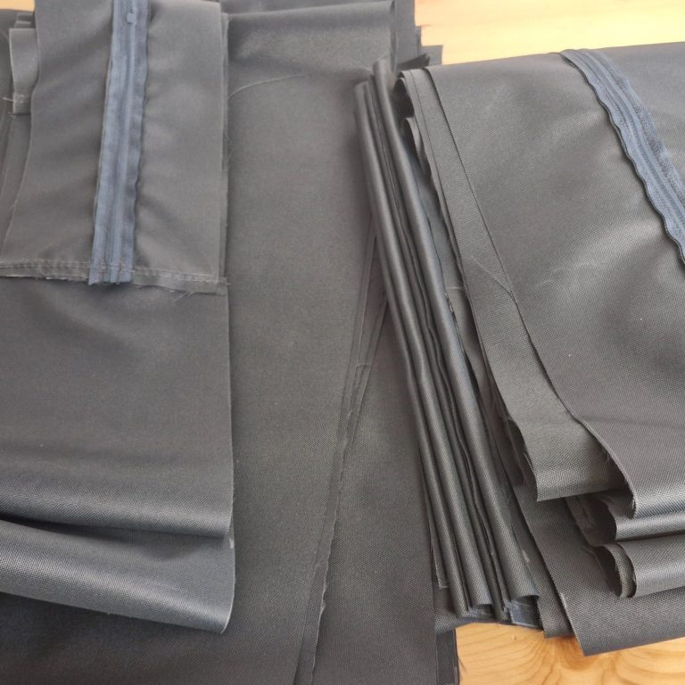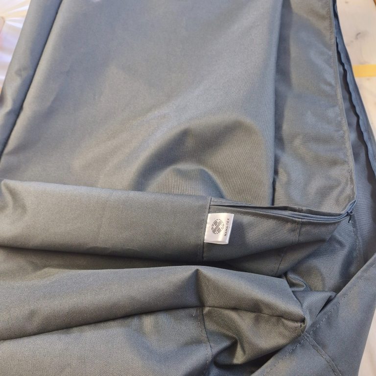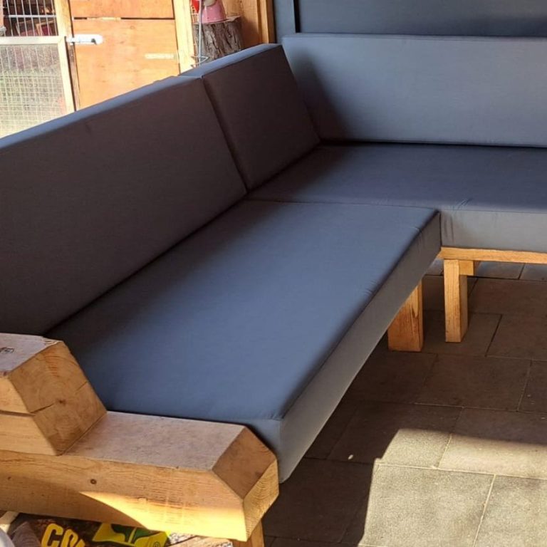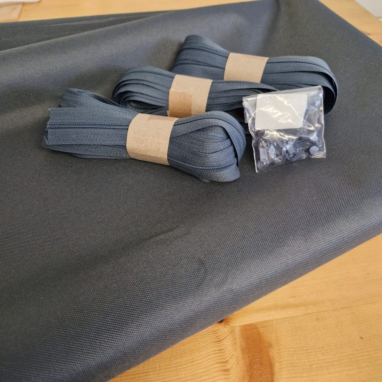 Daraus ergab sich direkt ein nächstes spannendes Projekt: Eine Terrassenbank sollte neue Bezüge bekommen. Da die Bank Wind und Wetter ausgesetzt ist, waren die Anforderungen an den Stoff klar definiert: wasserdicht bzw. wasserabweisend und natürlich lichtecht. Die Farbwahl fiel diesmal auf ein elegantes, dunkles Anthrazit eine willkommene Abwechslung zum hellen Vorgänger, bei dem Schmutz leider schnell sichtbar wurde. Ein praktischer Reißverschluss zum einfachen Waschen durfte natürlich auch nicht fehlen.